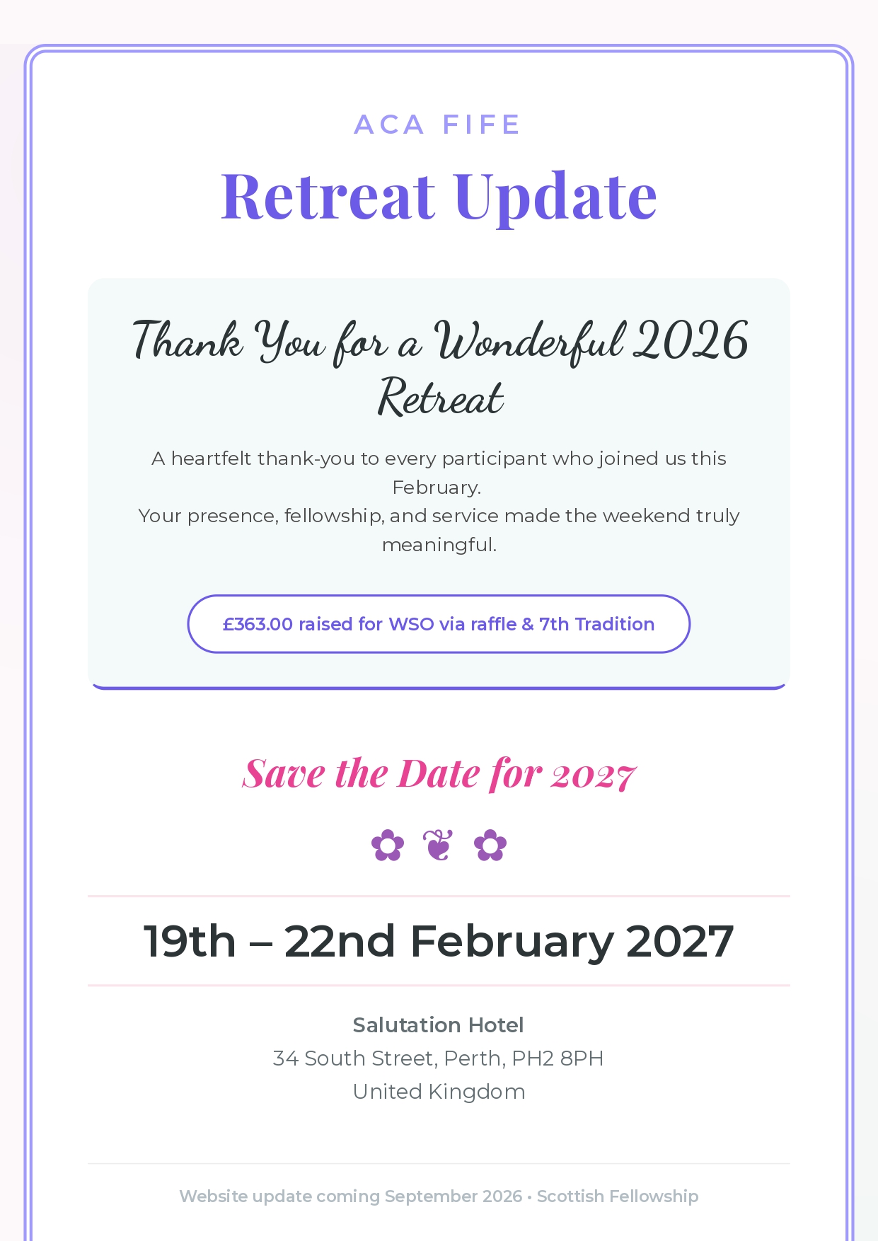 We are pleased to share that a total of £241.51 was successfully gathered from the Fife ACA Retreat 2025. These proceeds were generously contributed through the 7th Tradition and the event raffle.